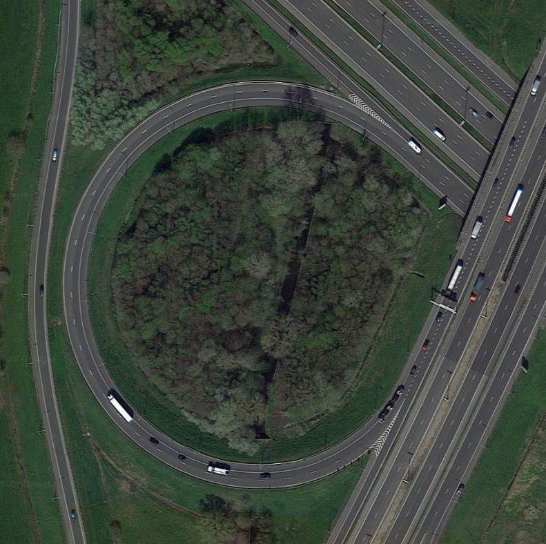 Het zuidelijke klaverblad in de bocht afrit Brugge (E40 richting Gent) is vlak, nat en slechts begroeid door grassen en kruidachtige planten. Er is geen aanplant of spontane groei van bomen te bespeuren. Logischerwijs omschrijven we dit landschap als hooiland.