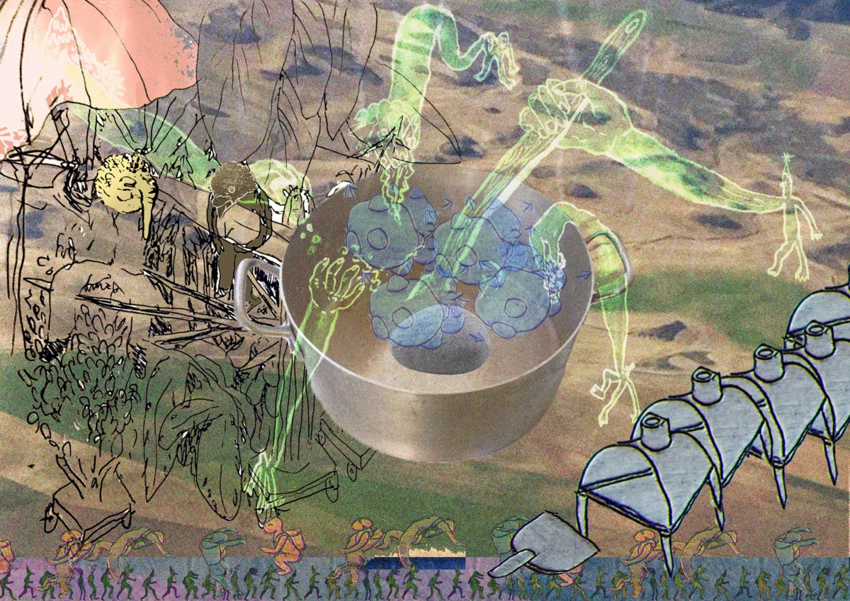 Deze afbeelding (zie boven, nvdr.) representeert het proces van Stone soup. De lege pot kan gevuld worden met ingrediënten en verhalen, in relatie tot de omgeving en de ontmoetingen die erin plaatsvinden. De afbeelding kwam tot stand door een Photoshop-bestand over en weer te sturen naar elkaar, een opeenstapeling van lagen en ideeën als analogie voor de manier waarop we samenwerken.