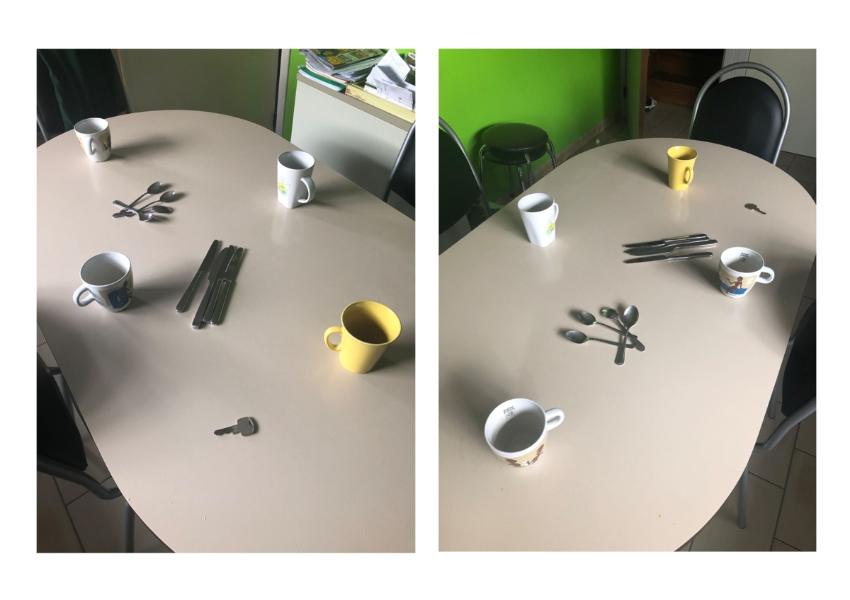 Als ik in beelden nadenk over mijn lopend onderzoek, komt deze foto van de tafel van Marijke en Noël vaak terug (zie boven, nvdr.). Het is de keukentafel die Noël op de ochtend van ons vertrek uit Bekegem op zijn eigen manier gedekt heeft. Dit beeld typeert hoe ik de twee Bekegemenaren zie. Toen ik voor het eerst bij hen logeerde, vertelde Noël me dat hij geen ‘moderne man’ was, omdat naar eigen zeggen geen rol opnam in het huishouden. De ochtend waarop we zouden vertrekken was Noël al naar zijn werk vertrokken, maar had hij toch de moeite genomen om de tafel nog even te dekken. Een gedekte tafel zonder borden. Dat is omdat Marijke en Noël dat zo doen: hun boterhammen liggen gewoon op tafel, legden ze ons uit. Ik interpreteer die gedekte tafel nog steeds als een teken van zorg, de eigenheid van Marijke en Noël, en als een miniscuul spoor van verandering die de botsing van onze twee werelden teweeg bracht.