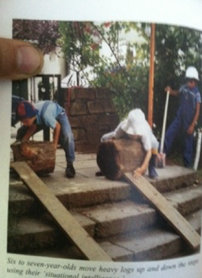 Dit beeld kreeg ik van een vriendin van mij, Amy Francescini, nadat we een gesprek hadden over dit project. Het is een beeld dat zij vond toen ze in het privé-boekarchief van de Oostenrijkse schrijver, architect en filosoof Rudolf Steiner rondneusde. In het bijschrift onder de kleine foto staat: “Six to seven-year olds moving heavy logs up and down the stairs using their situational intelligence”. Daarin zie ik de speelse eerste stappen voor Die malle Jan. Tegelijkertijd toont het een oefening die vaak terugkeert binnen mijn werk.