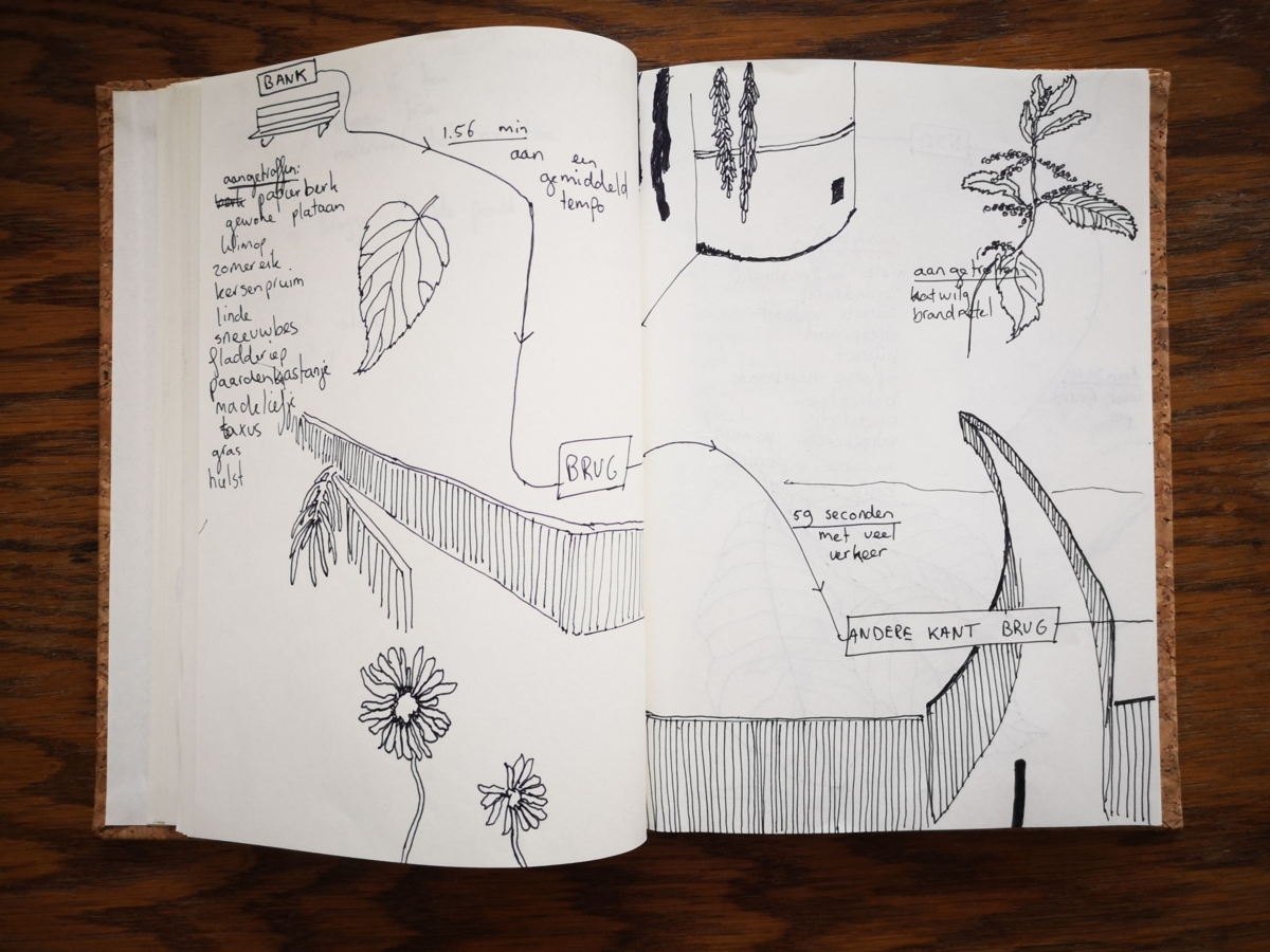 Sinds begin juli ben ik bezig met het maken van een audiotocht over het wilde paard. De tocht vertrekt vanuit het stadscentrum van Brugge, waarbij je de stad steeds meer achter je laat en de natuur in loopt. In ieder geval figuurlijk. Ik time daarbij elk stukje van de wandeling en breng de omgeving in kaart, die ik dan later verwerk in de audio-opnames die ik maak. Op de oevers van de Brugse vesten deed ik een hele dag over het catalogiseren van alles wat groeide op een stukje van 100 meter. Ik schoof elke vijf minuten een stukje op om aantekeningen te maken en de planten in een beeld te vangen. Van de grote kattenstaart tot aan de californische cipres, van de gewone esdoorn tot aan het biggenkruid. Uiteindelijk komen de aantekeningen in een grote kaart die je meeneemt op de tocht.