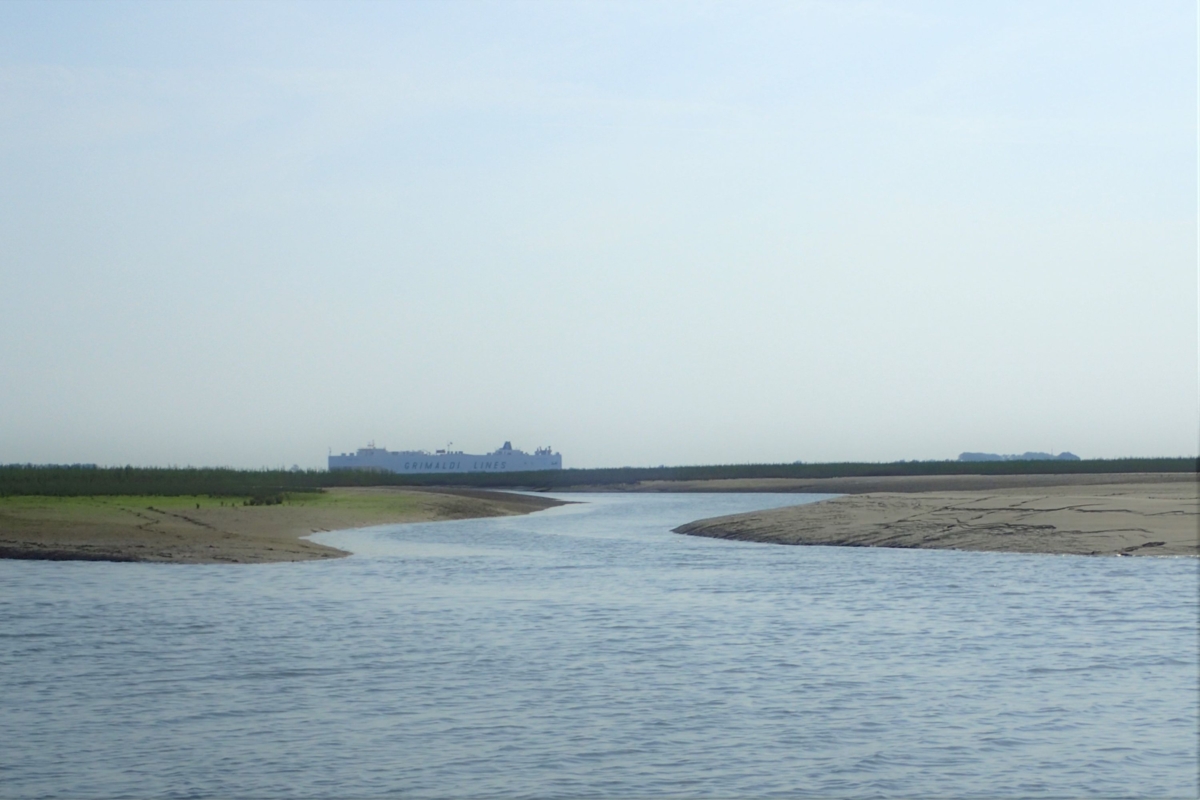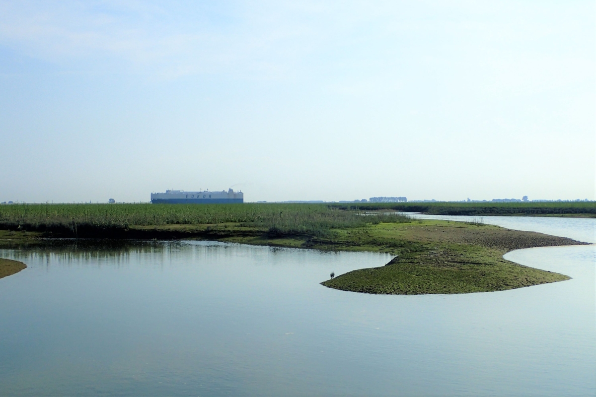 Toen ik er begin augustus was, op de plaat, kwam er onder het varen plots een zeehond piepen. Hij keek ons aan en wij hem. Het was warm en er stond geen zuchtje wind. Het water in de kilometers brede Westerschelde was zo glad als een spiegel. Het zwarte kopje verscheen en verdween in een cirkel van rimpels. En zoals het dier gekomen was, zo was het plots weer weg, de diepte van de vaargeul in. Boven hem, aan het oppervlak, dreunen de grootste bewegende constructies op aarde: olietanker, auto- en containerschepen. Ze varen af en aan naar de haven van Antwerpen en hun geronk en dieselgeur zijn tot voorbij de dijken waar te nemen. De grootste schepen nemen de geul ten zuiden van de plaat terwijl de binnenvaartschepen de noordelijke geul nemen.