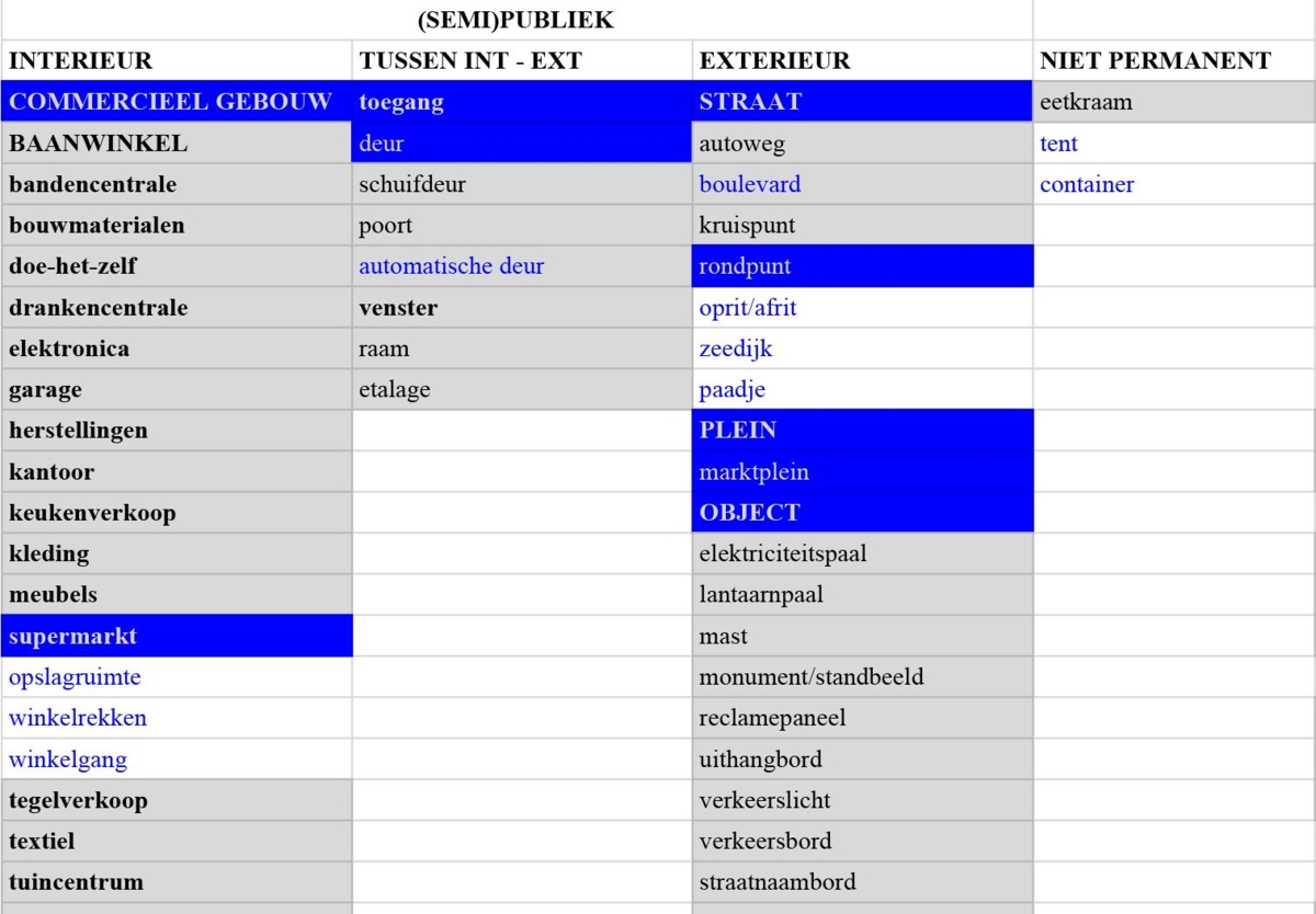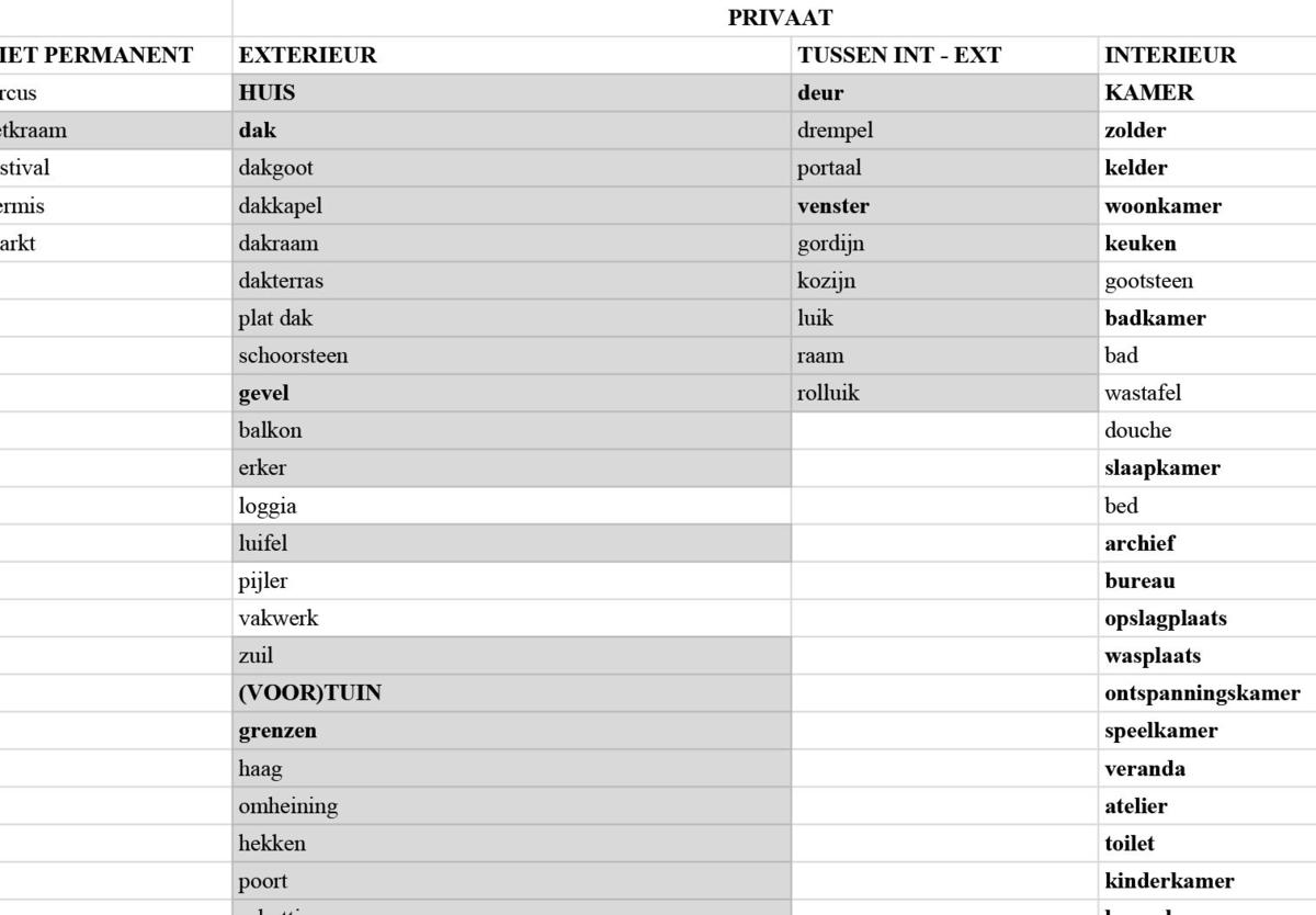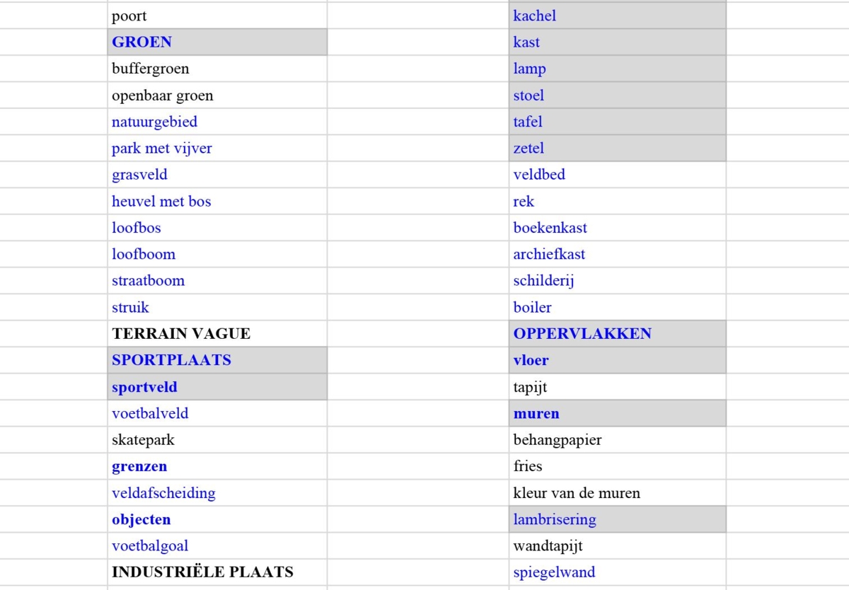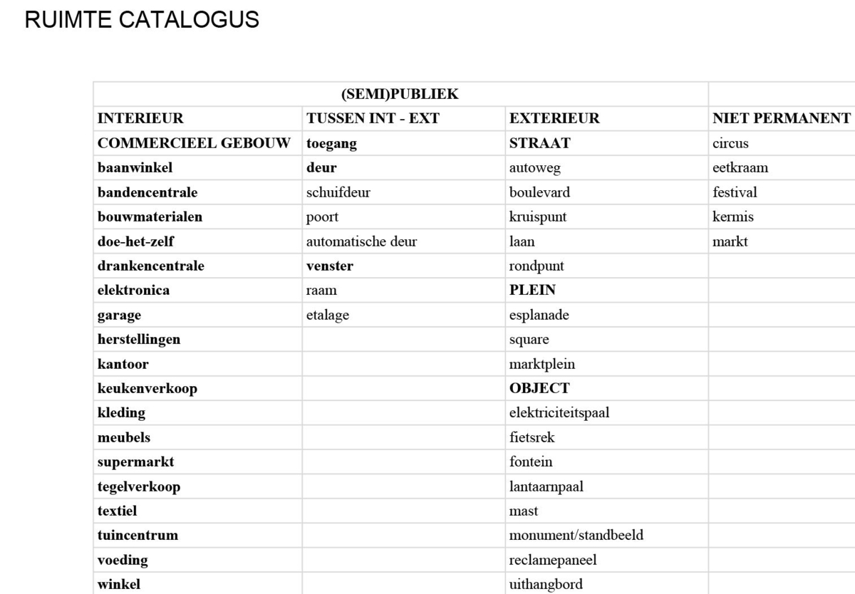 De ruimte catalogus is een uitdeinende opsomming van ruimtelijke elementen. Het is een document in beweging. De eerste versie werd opgemaakt vanuit een abstracte ruimtelijke classificatie van de werkelijkheid, als startpunt.