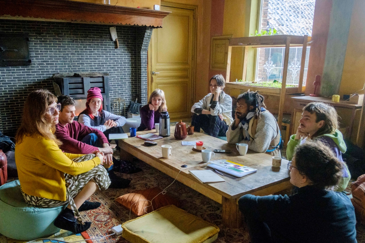 Barbara T’Jonck voert binnen veldwerk een artistiek onderzoek naar collectieve plattelandswoningen. Daarvoor gaat ze op bezoek bij verschillende soorten woongemeenschappen in binnen- en buitenland, waaronder de Welenhoeck in Herzele. In maart nam ze de hele groep mee naar deze plek om een inzicht te geven in het reilen en zeilen van zo’n gemeenschap, de beweegredenen van de bewoners, het samenleven met elkaar en de buurt, en het bredere onderzoek dat ze voert.