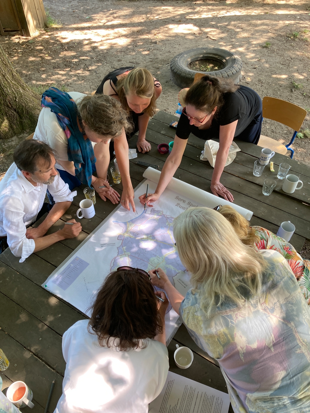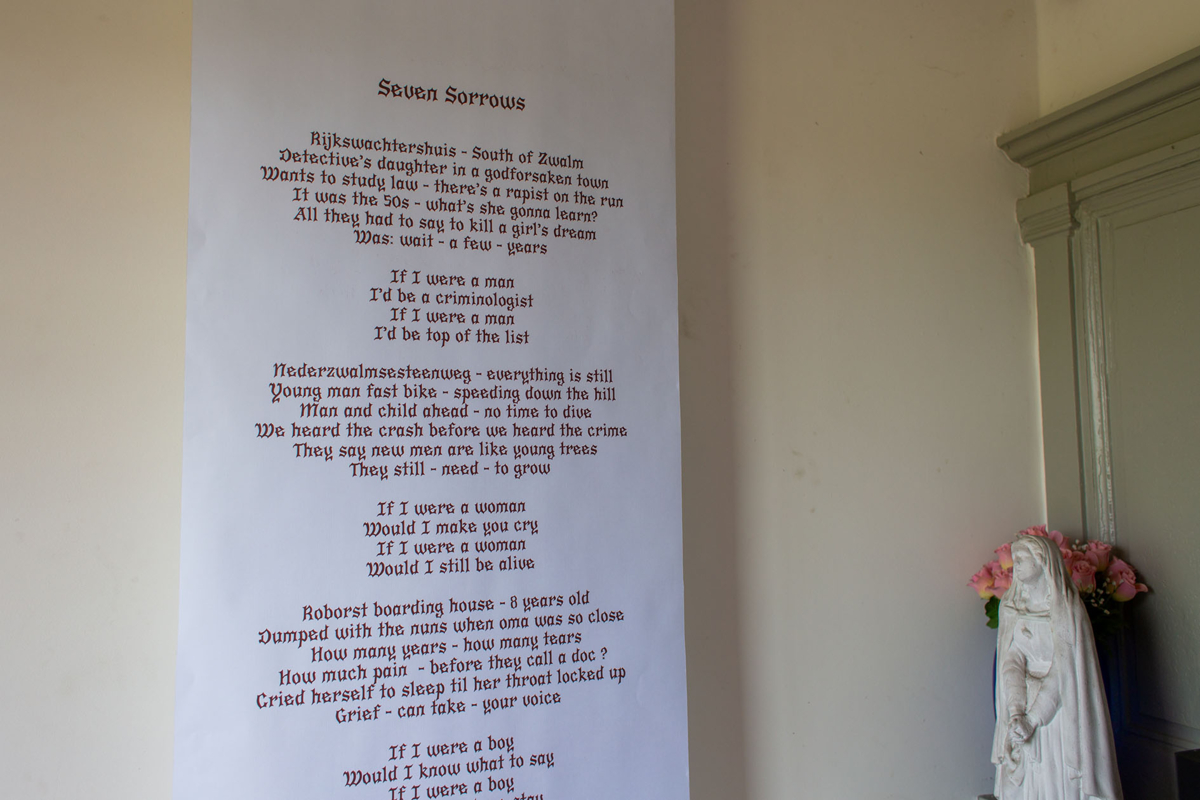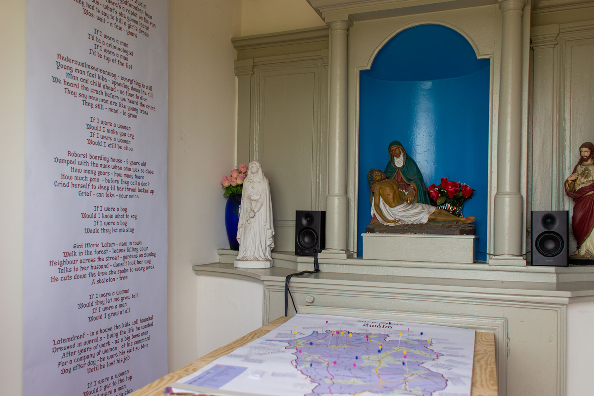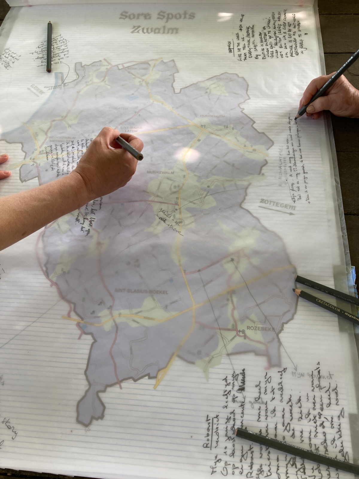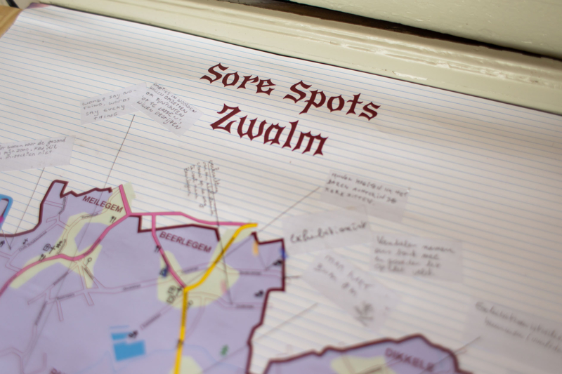 Aan de grondslag van Sore Spot Songs ligt een workshop waarbij ze samen met een groep inwoners de pijnpunten van de Zwalmstreek in kaart brachten. Daarbij gaven ze speciale aandacht aan de sore spots die ontstaan vanuit onze identiteit van man, vrouw of non-binaire persoon. Een middag lang werden verhalen van verdriet en twijfel, maar ook troost en thuiskomen gedeeld met elkaar. Het resultaat was te zien op een kaart, ontworpen door Myrna D’Ambrosio. Voorbijgangers die een link met Zwalm hebben, werden uitgenodigd om ook hun eigen verhaal te delen op de kaart. Van deze verhalen maakten Sarah en Esther een lied – een sore spot song - die te horen was in de kapel.