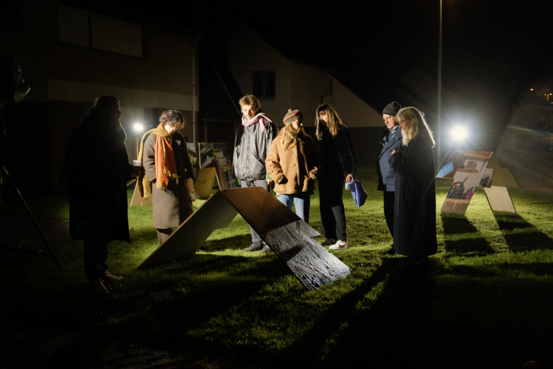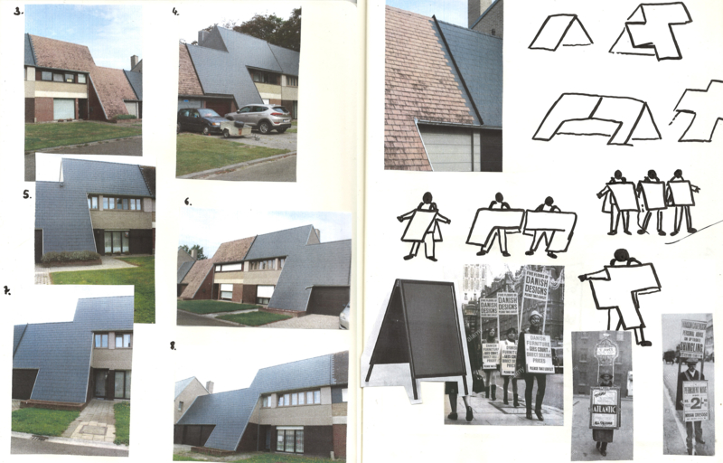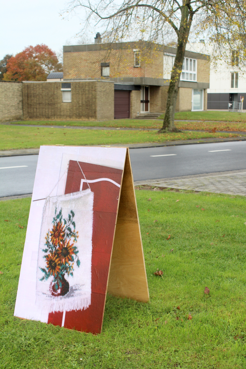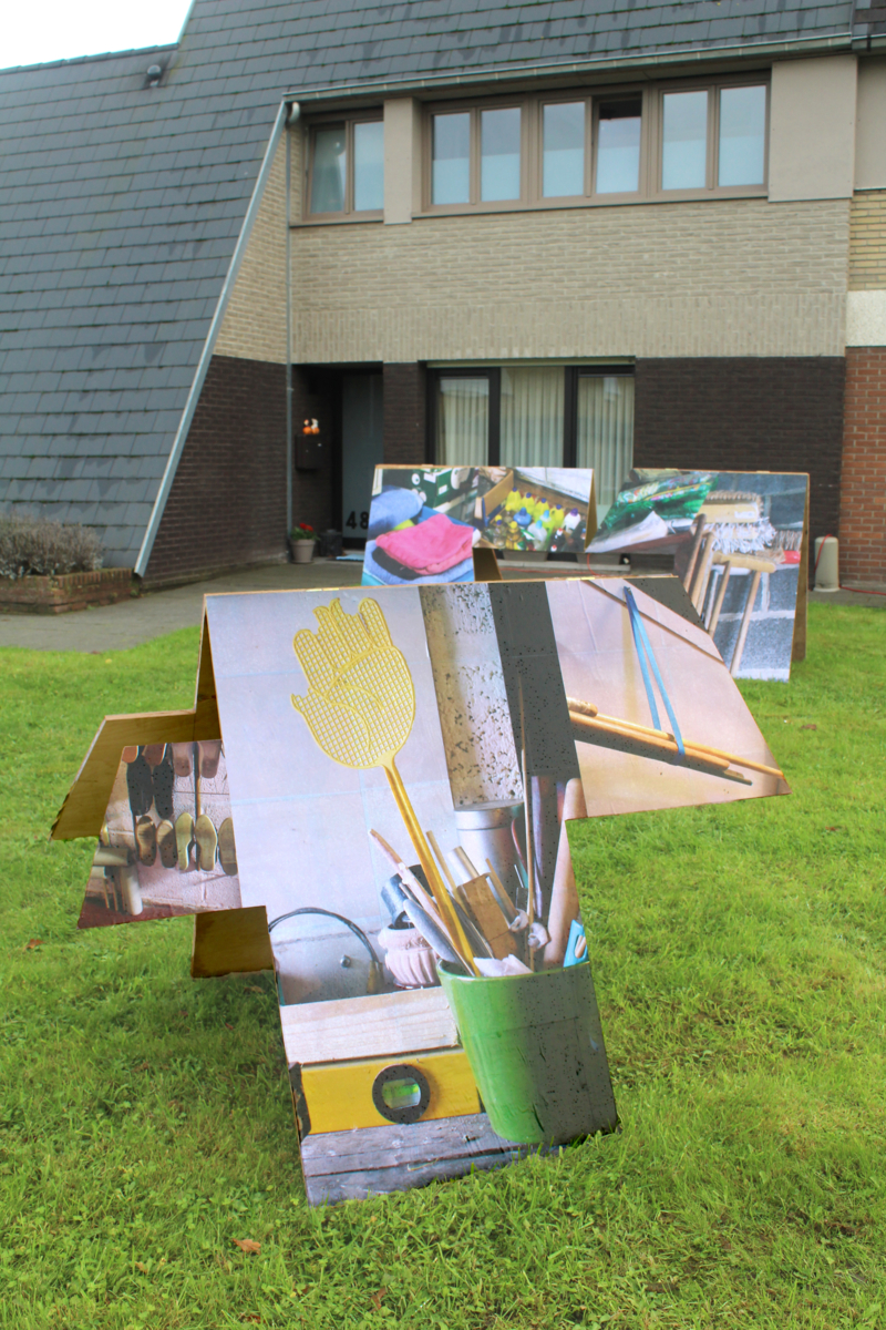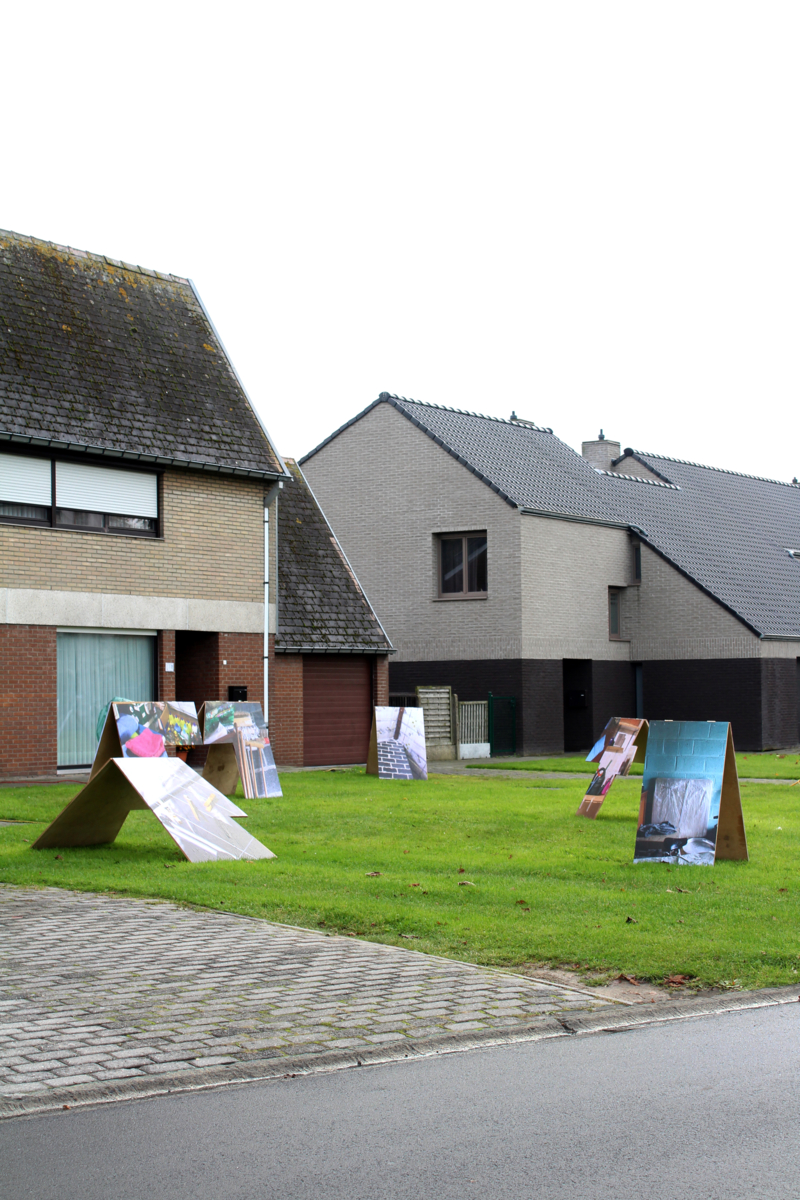 Tijdens een wandeling in de Stokveldewijk raakte Julie gefascineerd door de jaren ‘70 bouwstijl die sommige huizen karakteriseert. Een opvallend kenmerk daarbij is dat de daken soms het gehele huis lijken te overdekken, van de grond af. Dat spreekt tot de verbeelding. Wat gaat er verborgen onder die grote daken? Wat blijft normaal gezien onzichtbaar? Ze fotografeerde de binnenruimtes van deze huizen, en door deze daken als element uit de wijk te tillen, speelt ze ook in op een ander iets dat haar fascineert. In haar thuisstad Brussel wordt ze immers elke dag overdonderd door een veelheid aan beelden, neonlichten en posters. Hier is alles serener. Door deze daken uit te roepen tot ‘beelden’, en deze publiek tentoon te stellen in de wijk geeft ze hier een antwoord op.